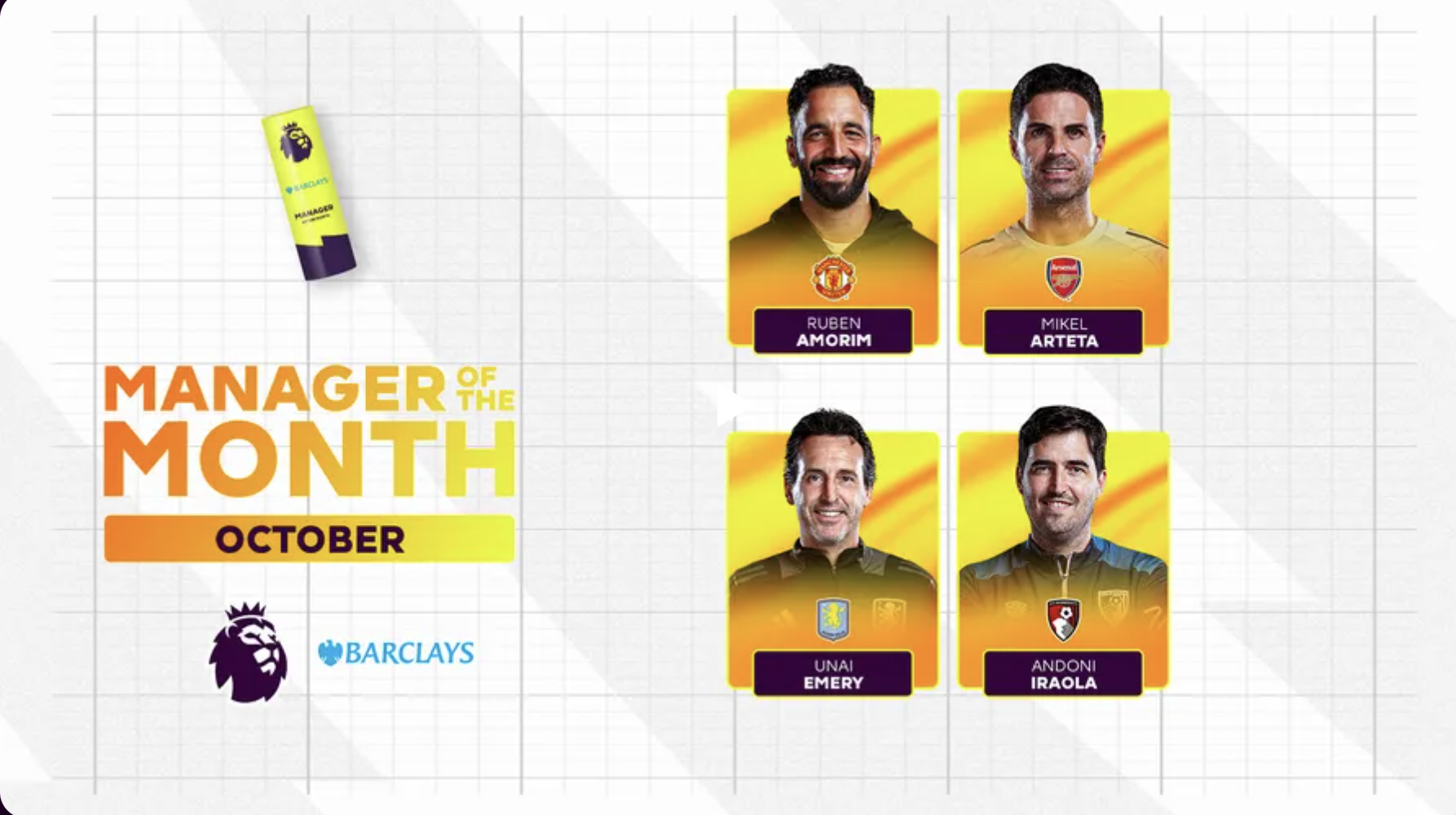 على جانب آخر، تم ترشيح 4 أسماء للفوز بجائزة أفضل مدرب في الشهر، وضمت القائمة كلا من الإسباني ميكيل أرتيتا "آرسنال"، البرتغالي روبن أموريم "مانشستر يونايتد"، الإسباني أوناي إيمري "أستون فيلا"، والإسباني أندوني إيراولا "بورنموث".