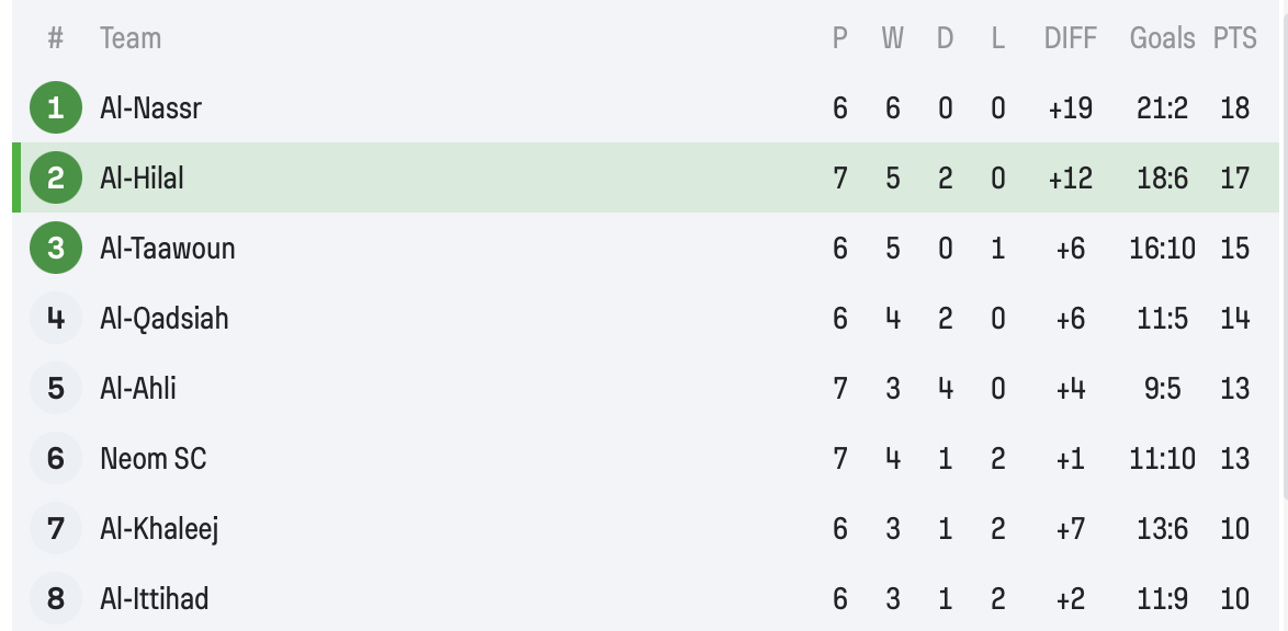 بهذه النتيجة، قفز الهلال لوصافة الترتيب برصيد 17 نقطة، وخلف النصر المتصدر بنقطة واحدة ولكنه لعب مباراة أقل.