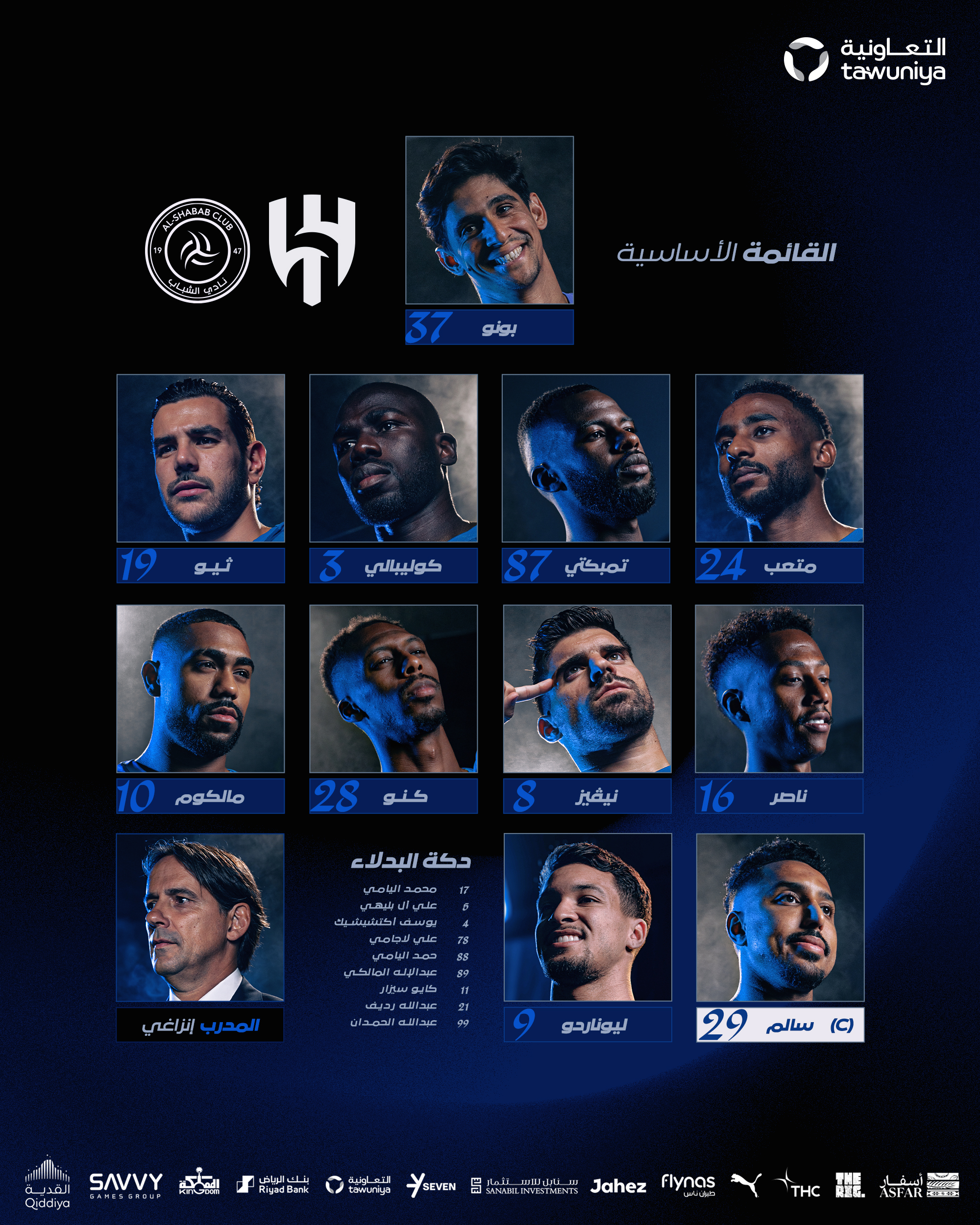 تشكيل الهلال: بونو - متعب - تمبكتي - كوليبالي - ثيو هيرنانديز - ناصر - نيفيز - كنو - مالكو - سالم - ليوناردو
