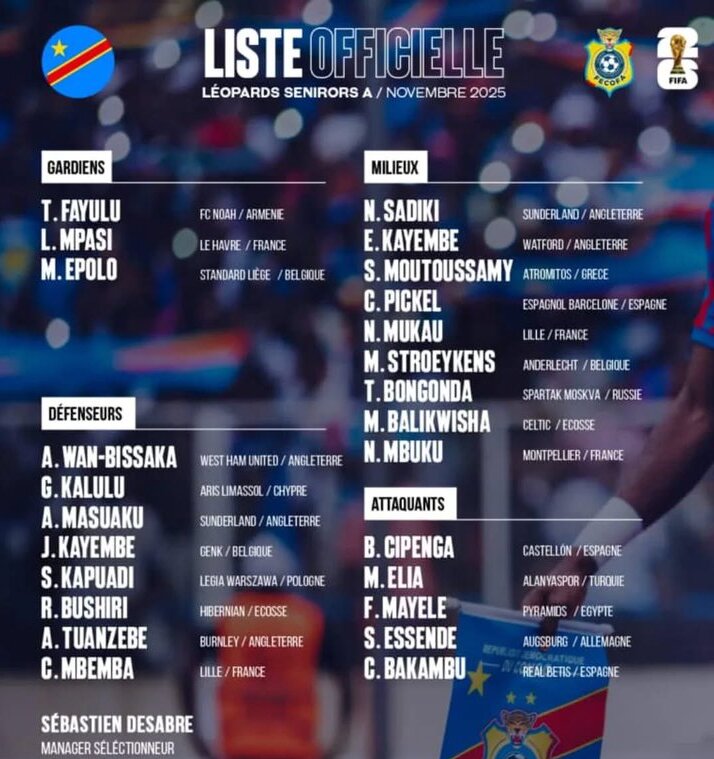 أعلن الفرنسي سيباستيان ديسابر المدير الفني لمنتخب الكونغو الديمقراطية عن القائمة التي تستعد لخوض الملحق الأفريقي بالتصفيات المؤهلة لكأس العالم 2026.