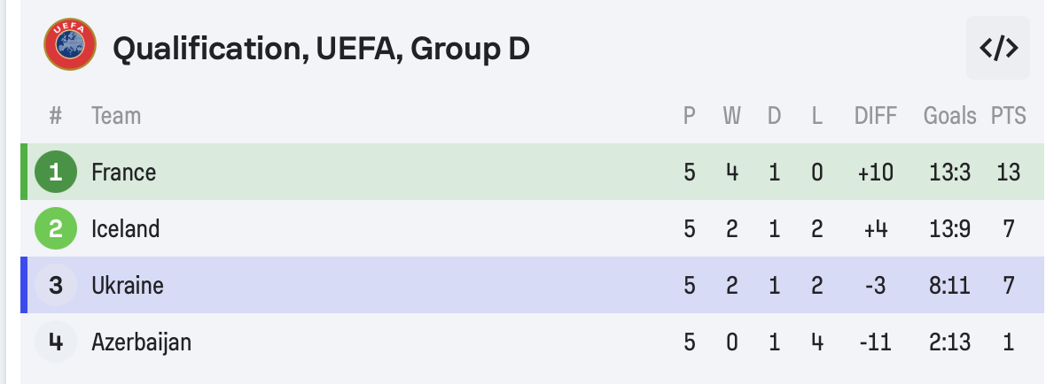 وبذلك الفوز رفع المنتخب الفرنسي رصيده لـ13 نقطة في الصدارة وبفارق 6 نقاط كاملة عن أيسلندا ليضمن تأهله رسميا.