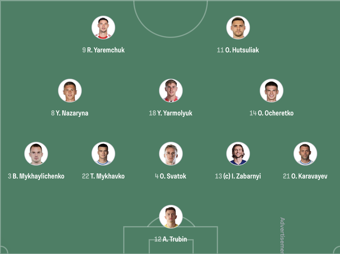 تشكيل أوكرانيا: توربين - ميخايليشينكو - ميخافكو - سفاتوك - زابارني - كارافايف - نازارينا - يارموليوك - أوتشريتكو - ياريميتشوك - هوتسولياك