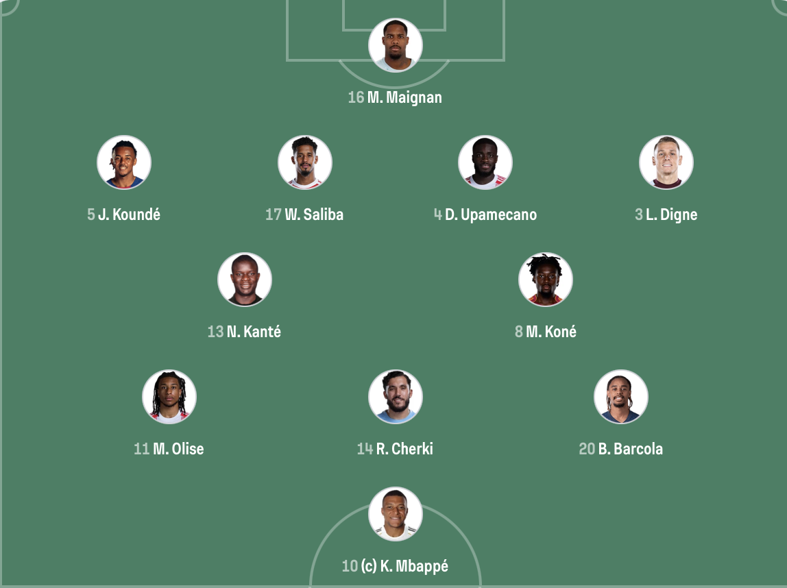 تشكيل فرنسا: ماينان - كوندي - ساليبا - أوباميكانو - لوكاس دين - كانتي - كونيه - شرقي - أوليسيه - باركولا - مبابي