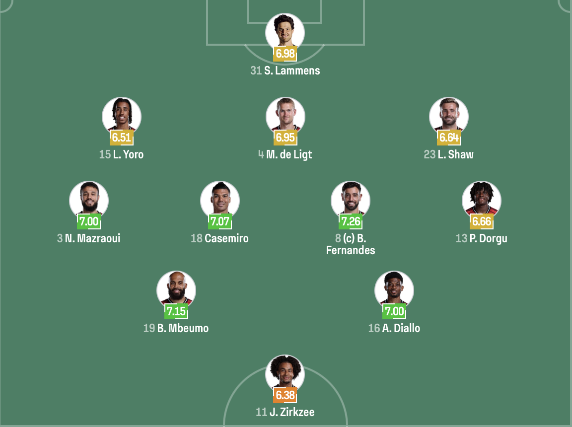 تشكيل مانشستر يونايتد: لامينس - مزراوي - يورو - دي ليخت - شو - دورجو - كاسيميرو - برونو فرنانديز - ديالو - مبويمو - زيركزي