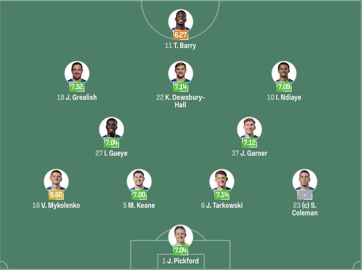 تشكيل إيفرتون: بيكفورد - كولمان - تاركوفسكي - كين - ميكولينكو - جارنر - إدريسا جاي - ندياي - ديوسبري هال - جريليش - باري