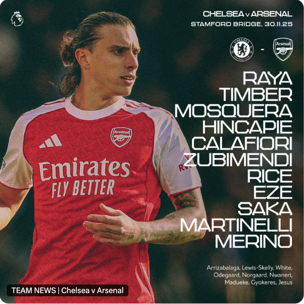 تشكيل آرسنال: رايا - تيمبر - موسكيرا - هينكابي - كالافيوري - إيزي - زوبيميندي - رايس - ساكا - مارتينلي - ميرينو