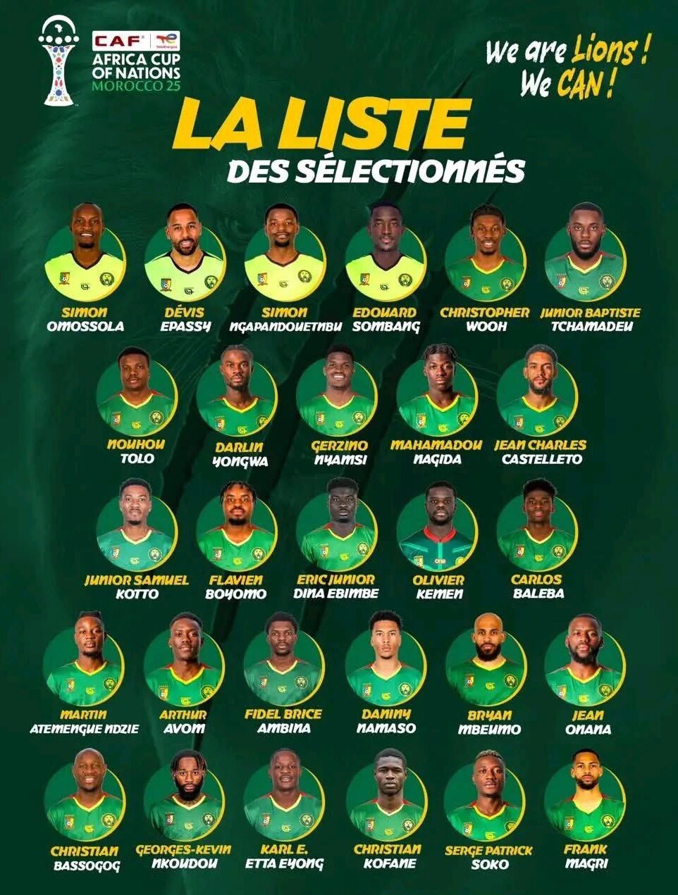 وجاءت قائمة منتخب الكاميرون كاملة كالتالي: