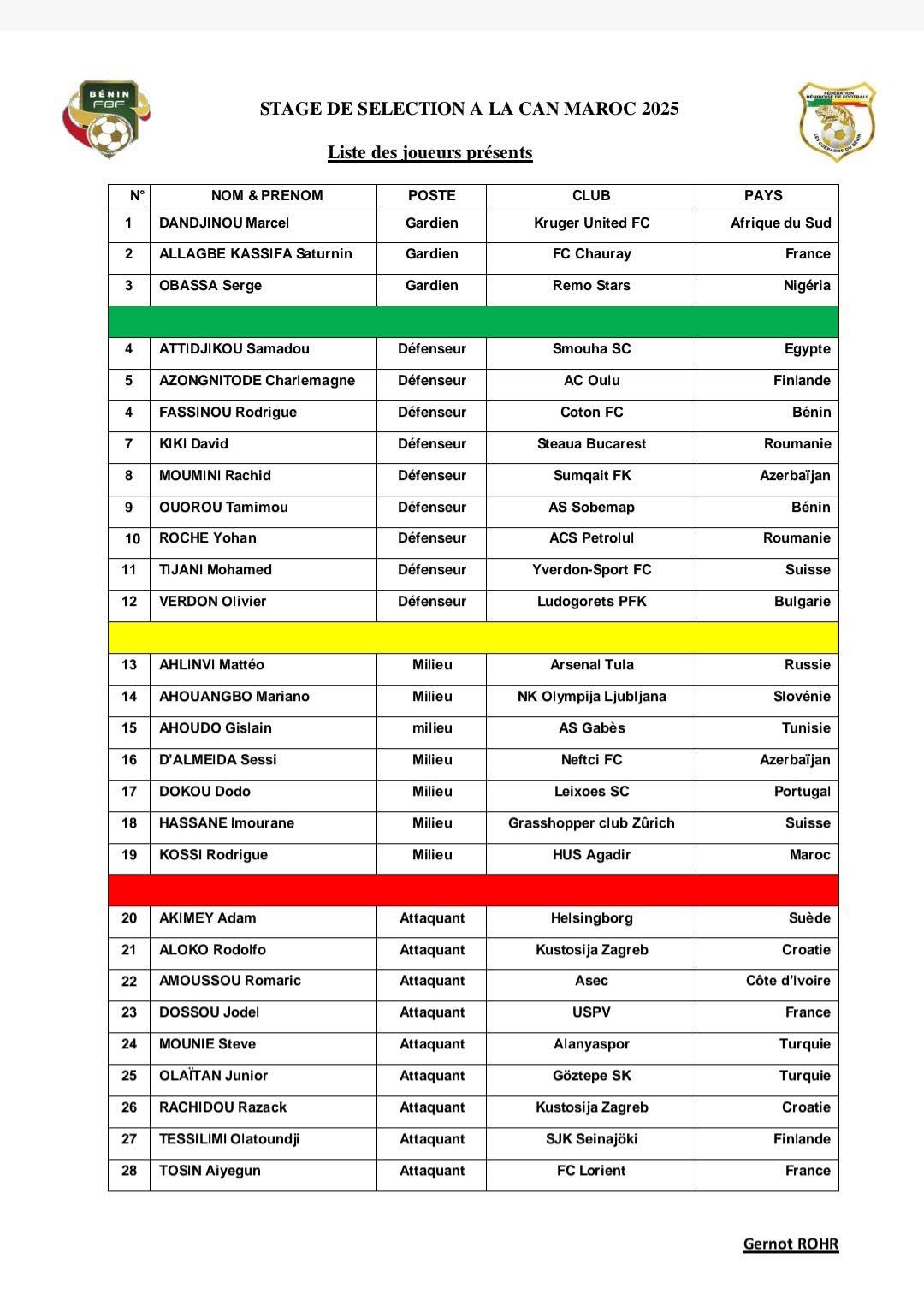 أعلن الألماني جيرنوت روهر المدير الفني لمنتخب بنين عن القائمة النهائية والتي ضمت 28 لاعبا من أجل المشاركة في بطولة كأس الأمم الأفريقية 2025.