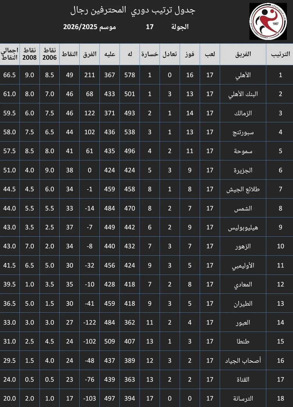 واصل فريق رجال كرة اليد بالنادي الأهلي تصدره لجدول ترتيب دوري المحترفين للموسم المحلي 2025-2026، بعدما رفع رصيده إلى 49 نقطة عقب الانتهاء من خوض جميع مبارياته المؤجلة، وذلك بعد فوزه الكبير على فريق الشمس بنتيجة 44-29، في اللقاء المؤجل من الجولة الرابعة عشرة للمسابقة.