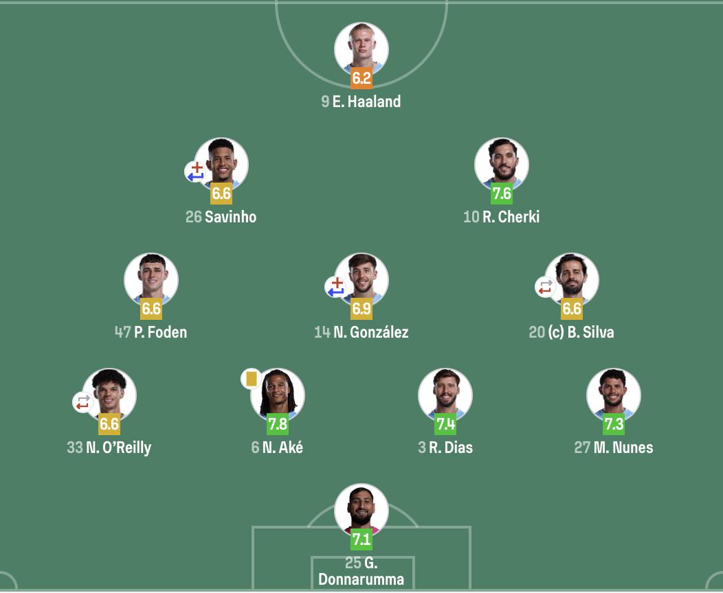 تشكيل سيتي: دوناروما - نونيز - دياز - آكي - أوريلي - برونو سيلفا - نيكولاس جونزاليز - فودين - شرقي - سافينو - هالاند
