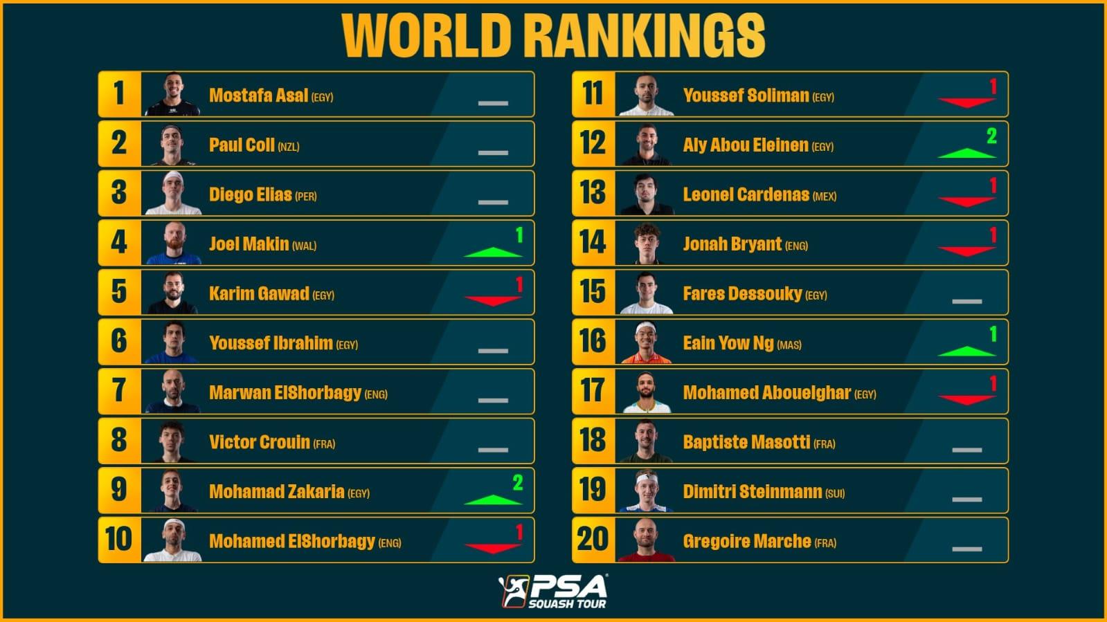 وشهد التصنيف الجديد إنجازا لافتا للبطل المصري الصاعد محمد زكريا، بطل العالم للناشئين، بعدما اقتحم قائمة العشرة الأوائل للمرة الأولى في مسيرته، عقب المستويات المميزة التي قدمها منذ بداية الموسم الحالي، والتي تُوجها مؤخرًا بالفوز بلقب بطولة ريتش فينوس كراتشي.