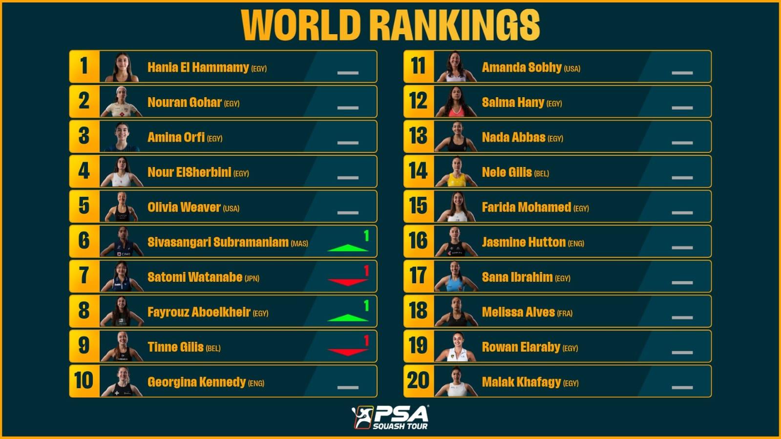 وعلى مستوى السيدات، تصدرت هانيا الحمامي التصنيف، تلتها نوران جوهر في المركز الثاني، ثم أمينة عرفي ثالثة، ونور الشربيني رابعة، تليها الأمريكية أوليفيا ويفر، ثم الماليزية سيفا سينجاري سوبرامانيام، فاليابانية ساتومي واتنبي، ثم فيروز أبو الخير، فالبلجيكية تيني جليس، واختتمت الإنجليزية جورجينا كيندي قائمة العشرة الأوائل.