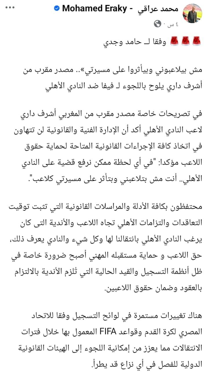 وكتب الناقد الرياضي محمد عراقي عبر حسابه الشخصي بأحد مواقع التواصل الإجتماعي قائلا عن احد المقربين من اللاعب المغربي أشرف داري أن الإدارة الفنية والقانونية لن تتهاون في اتخاذ جميع الإجراءات القانونية المتاحة للحفاظ على حقوق اللاعب مؤكدا في أي لحظة ممكن نرفع قضية على النادي الأهلي أنت مش بتلاعبني وبتأثر على مسيرتي كلاعب.وأضاف : أن اللاعب يحتفظ بكافة الأدلة والمراسلات القانونية التي تثبت مواعيد التعاقدات والتزامات الأهلي تجاهه، والعروض والأندية التي كان يرغب النادي في انتقاله إليها مشيرا إلى أن كل شيء موثق والنادي على علم بذلك. وشدد على أن حماية حق اللاعب ومستقبله المهني أصبحت ضرورة في ظل أنظمة التسجيل والقيد الحالية التي تُلزم الأندية بالالتزام بالعقود وضمان حقوق اللاعبين.وأنهى حديثه هناك تغييرات مستمرة في لوائح التسجيل وفقًا للاتحاد المصري لكرة القدم وقواعد FIFA المعمول بها خلال فترات الانتقالات ما يعزز من إمكانية اللجوء إلى الهيئات القانونية الدولية للفصل في أي نزاع قد ينشأ.