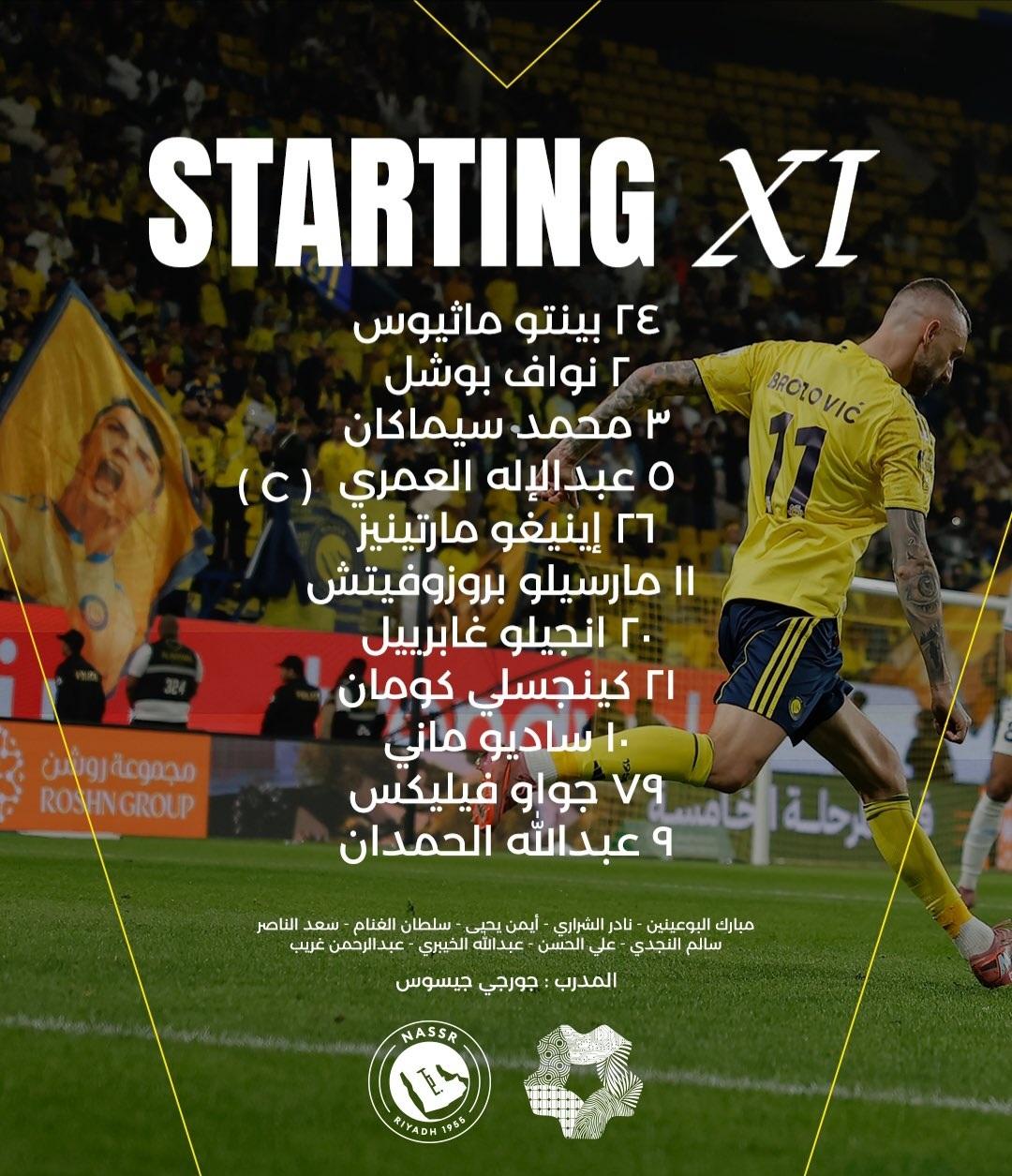 وفي ظل غياب الهداف البرتغالي " كريستيانو رونالدو " بداعي الإصابة، إختار مواطنه المدرب البرتغالي " جورجي جيسوس " دخول المواجهة بالتشكيل التالي: