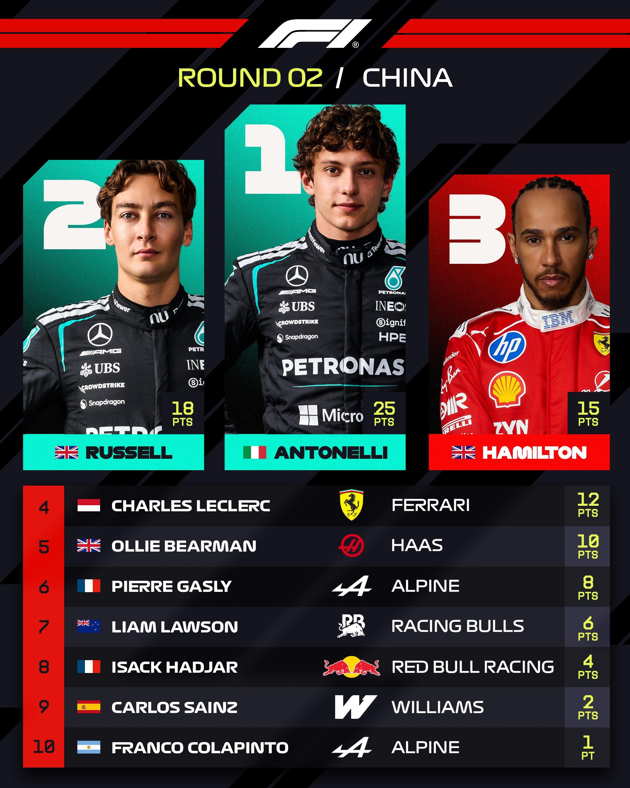 حقق الإيطالي كيمي أنتونيللي فوزه الأول في بطولة العالم لسباقات الفورمولا 1 بعدما توج بلقب جائزة الصين الكبرى، متفوقا على زميله في فريق مرسيدس جورج راسل، فيما صعد البريطاني لويس هاميلتون إلى منصة التتويج للمرة الأولى مع فريق فيراري.